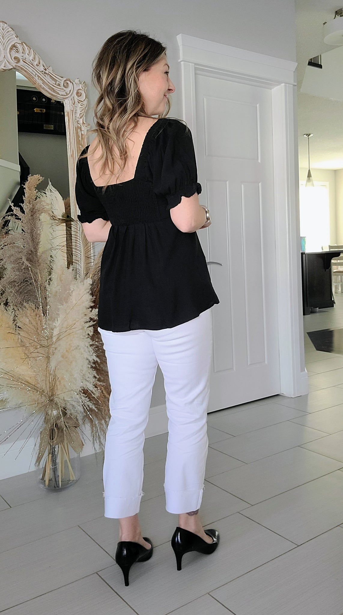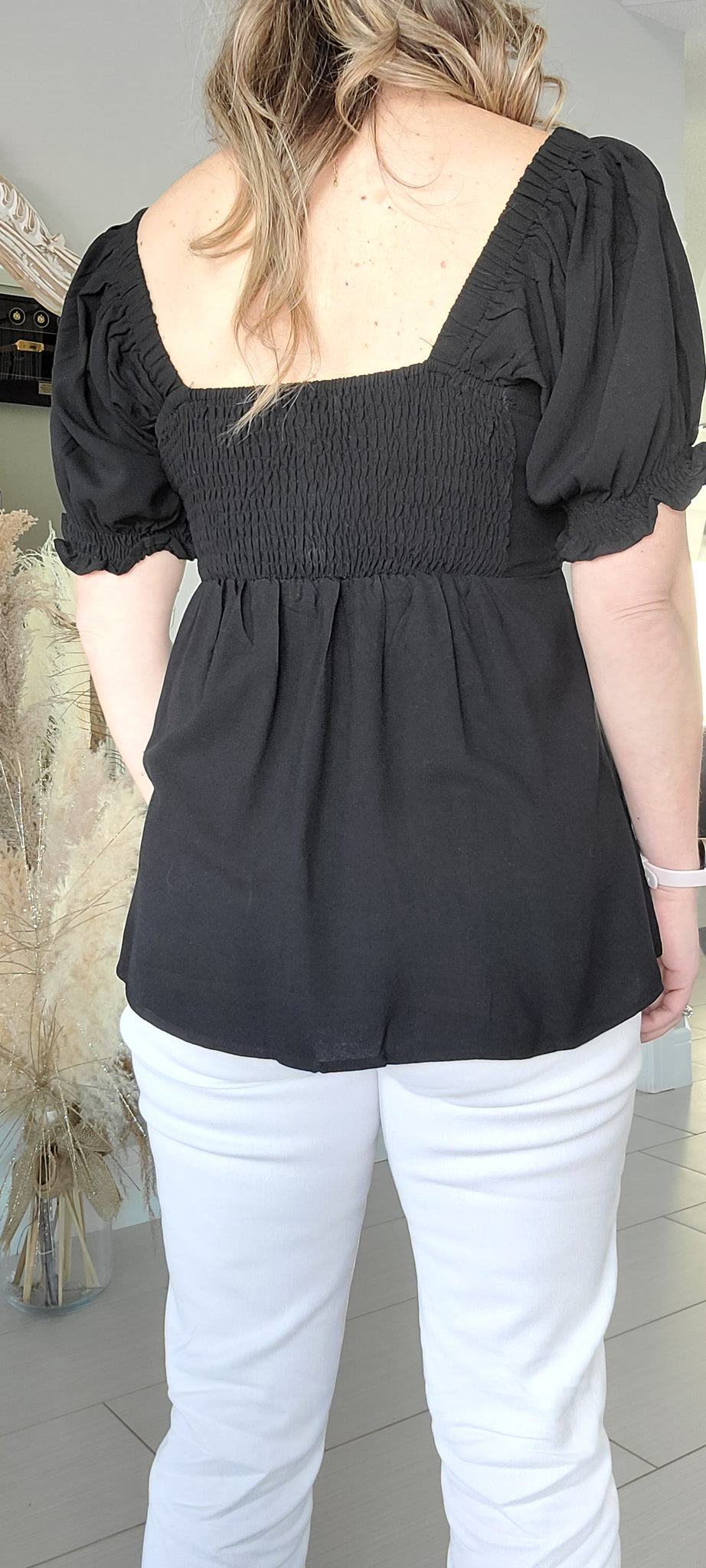 Adorable puff sleeves keep the vibe soft and romantic, while a smocked back panel ensures comfort and a just-right fit that moves with you.