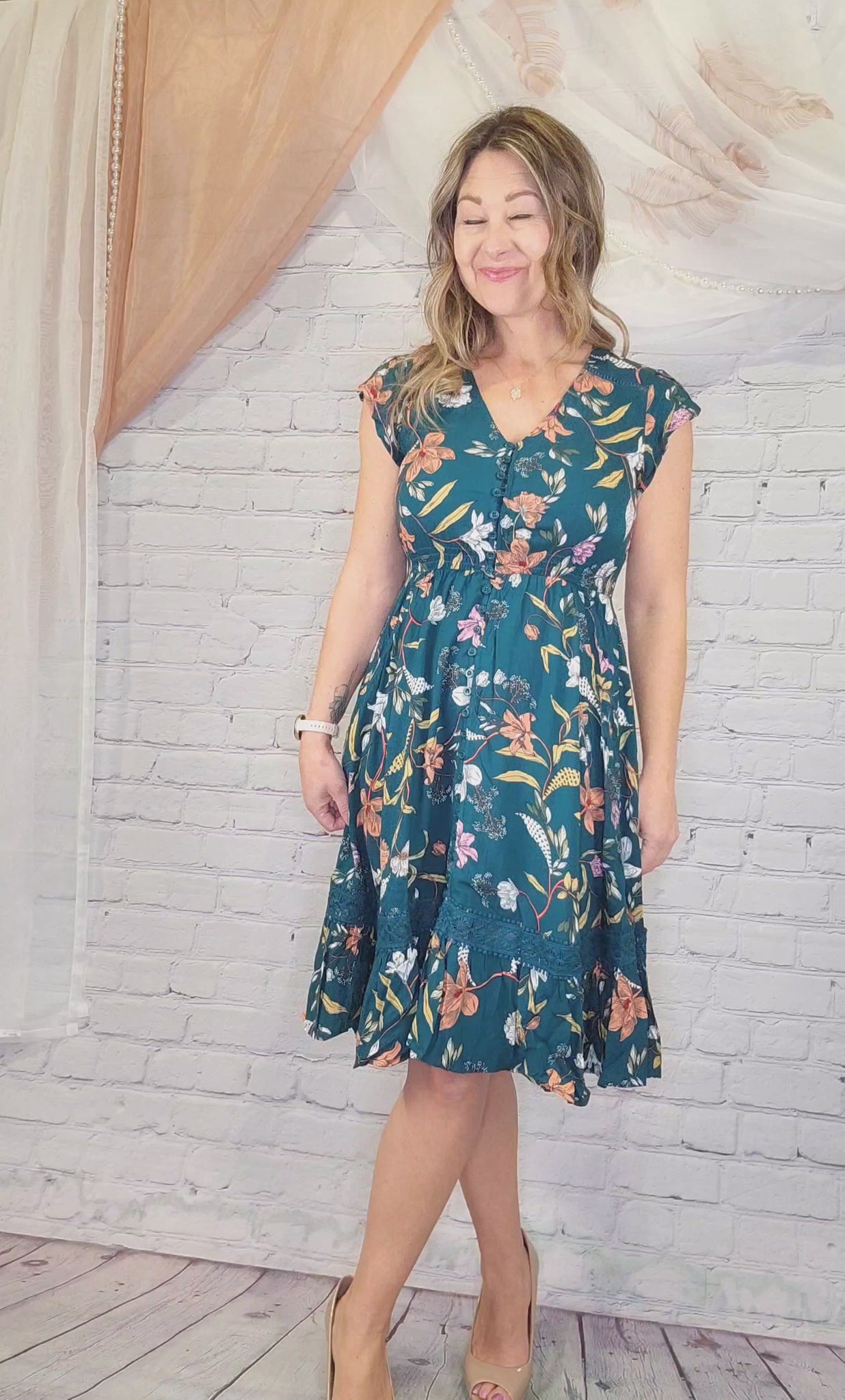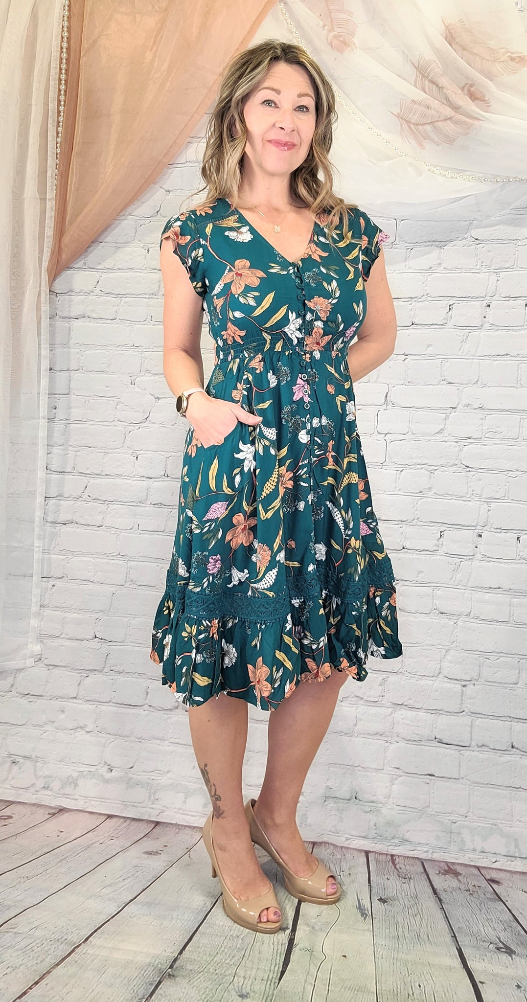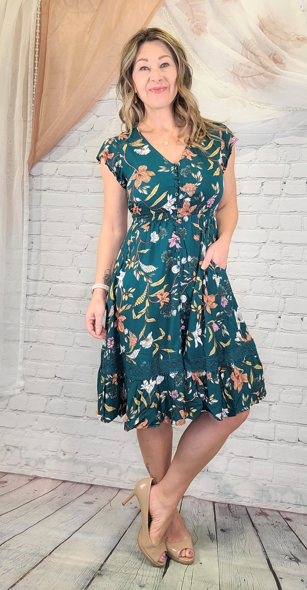 The Laguna Bloom Dress is a feminine, feel-good favorite designed to flatter and move with you. Featuring a rich turquoise base with vibrant floral hues of orange, pink, yellow, and white, this knee-length dress has a smocked empire waistband for comfort, a button-front detail, delicate lace trim along the hem, flirty cap sleeves, and a soft V-neckline. Easy, breathable, and beautifully body-friendly, it’s the perfect throw-on-and-go dress for sunny days, vacations, and effortless everyday elegance.