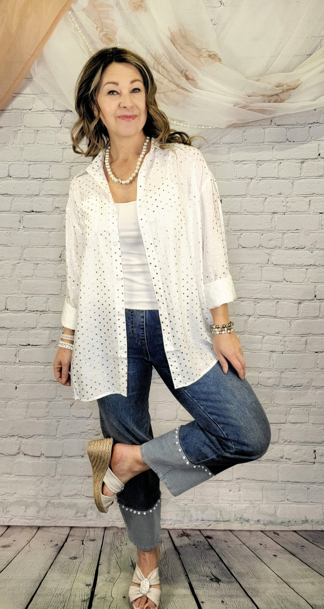 Elevate your wardrobe with the Polka-dot Button Up Shirt! Adorned with dazzling silver polka dots on a soft, smooth fabric, this versatile piece can be styled in countless ways. Whether you're hitting the beach or dressing up for a night out, it's a stunning addition that promises a perfect 10!