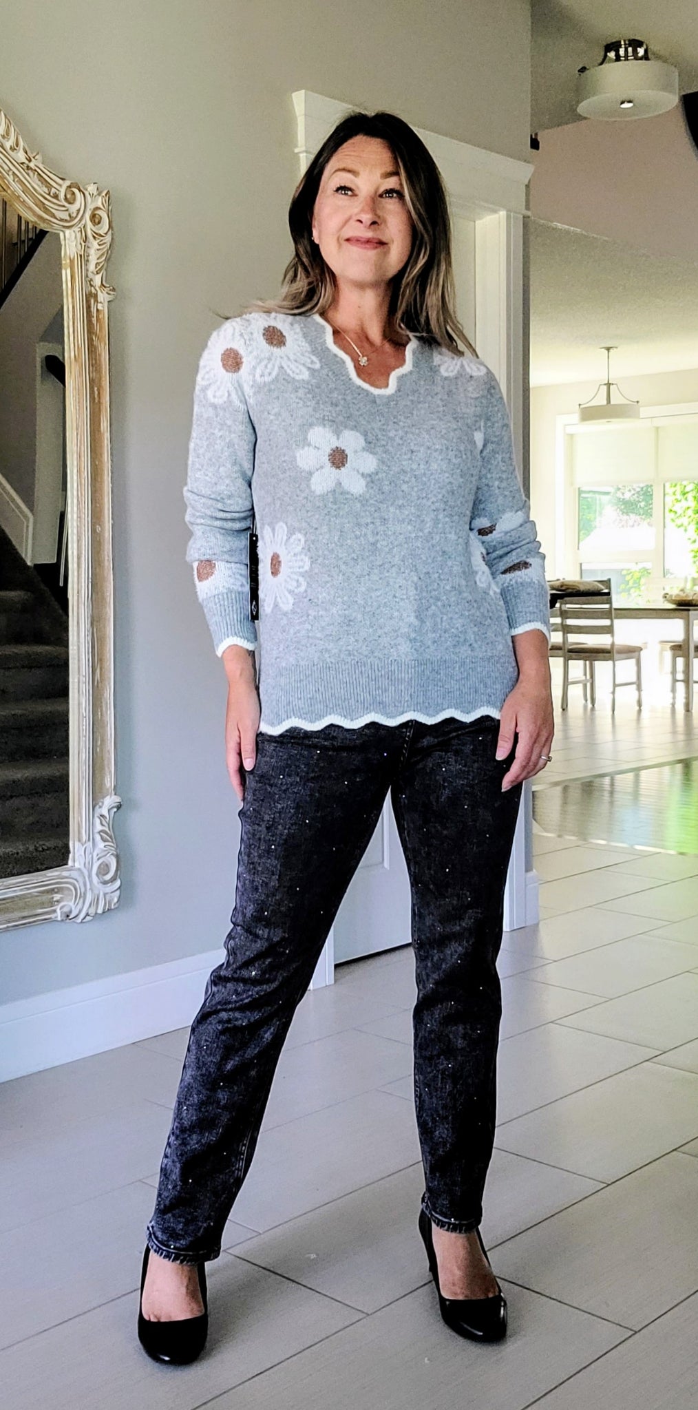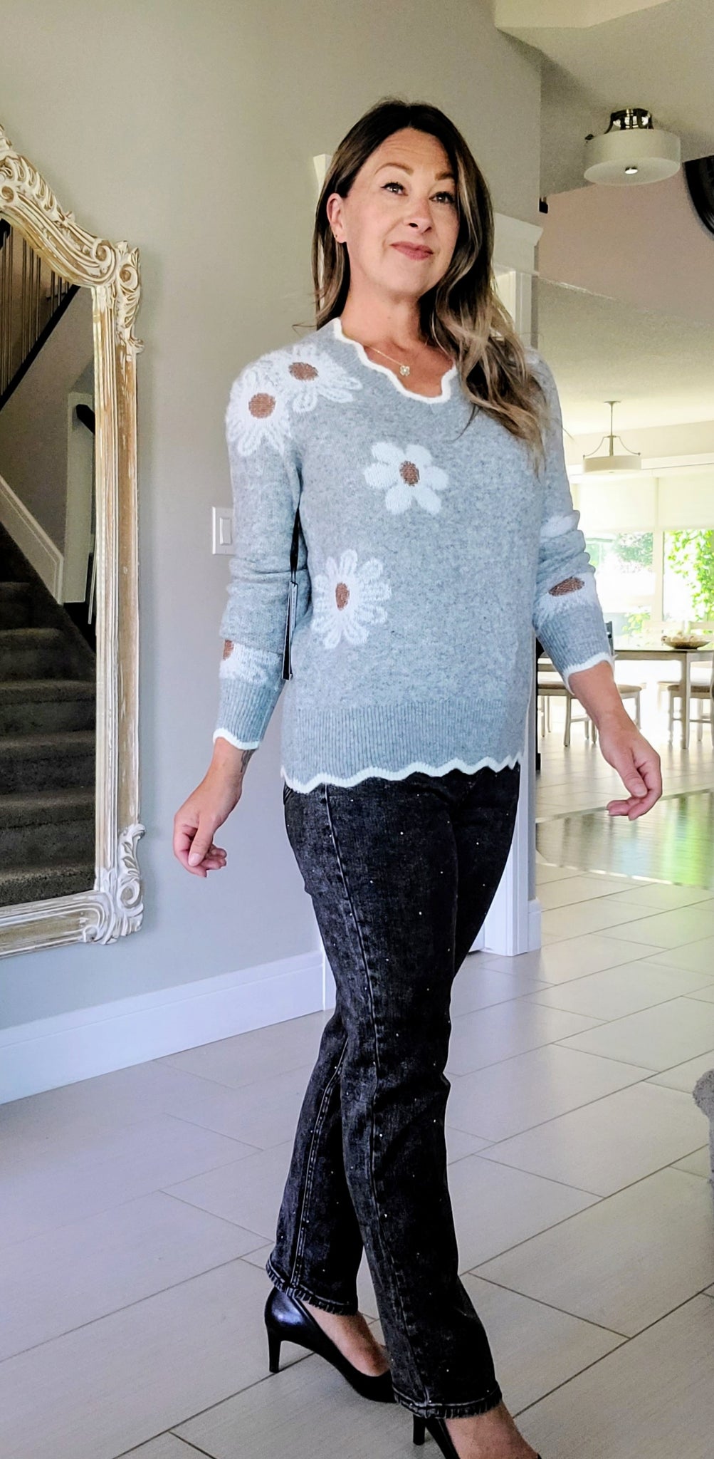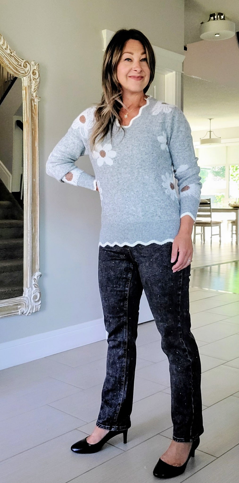 Get ready to feel cozy and look amazing in this soft Scalloped Grey Daisy Sweater. With its gorgeous scalloped edges and flattering scalloped vneck, this cheerful sweater will add a touch of whimsy to any outfit. The neutral tones make it a perfect pairing with your jeans and trousers, and its feel-good fabric will keep you warm and stylish all season long.