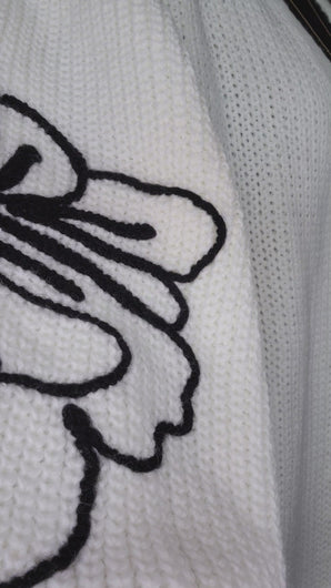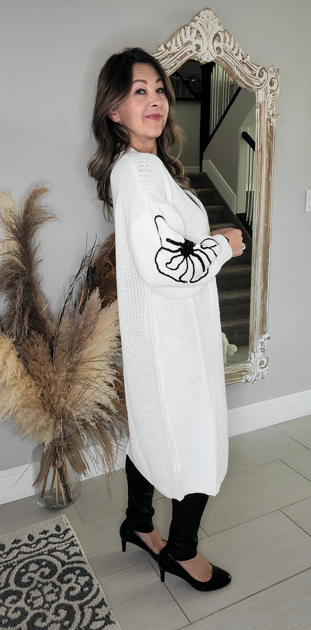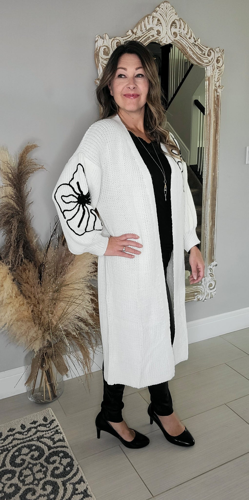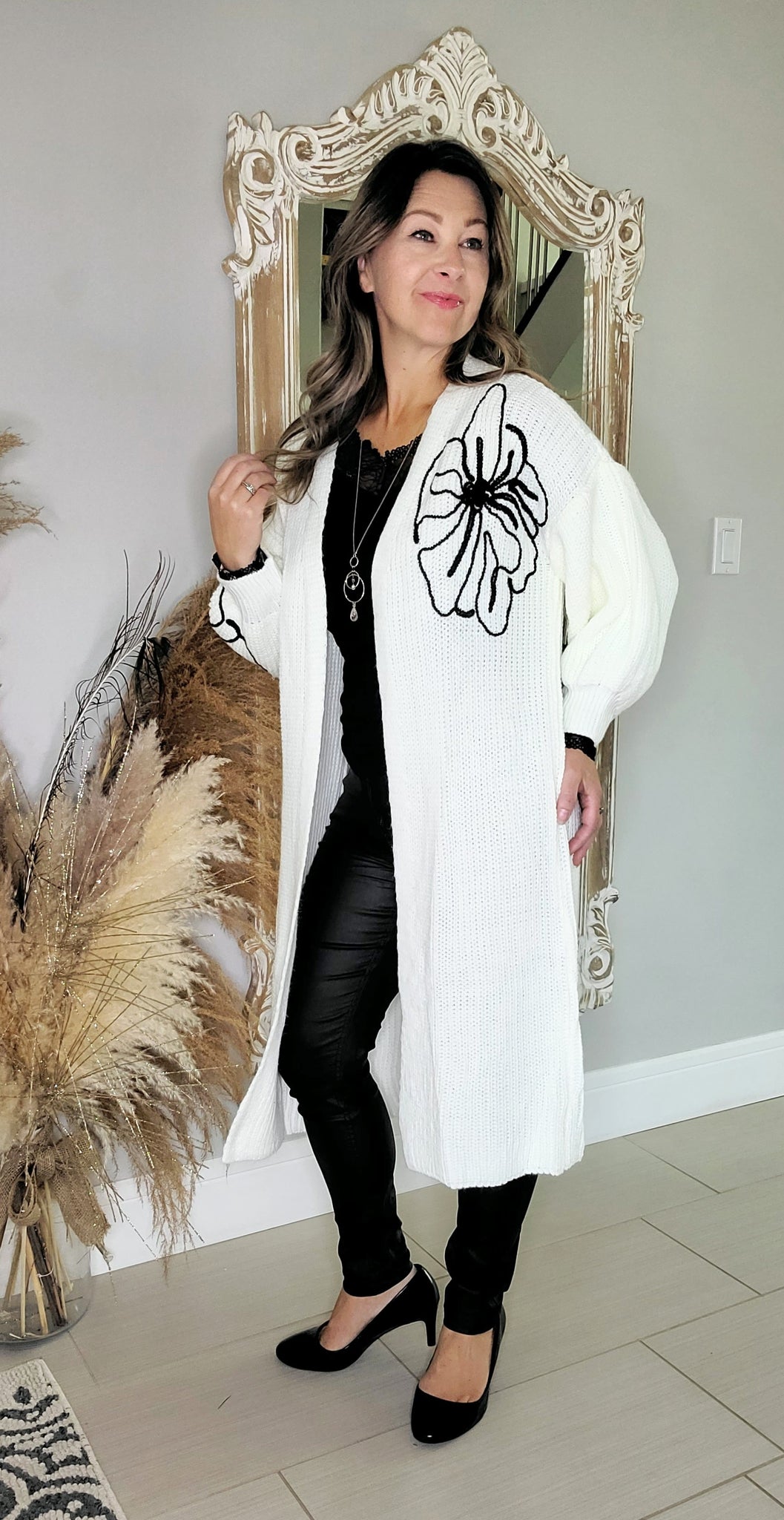This longline cream cardigan features striking black floral silhouette artwork — a statement in contrast, simplicity, and sophistication.