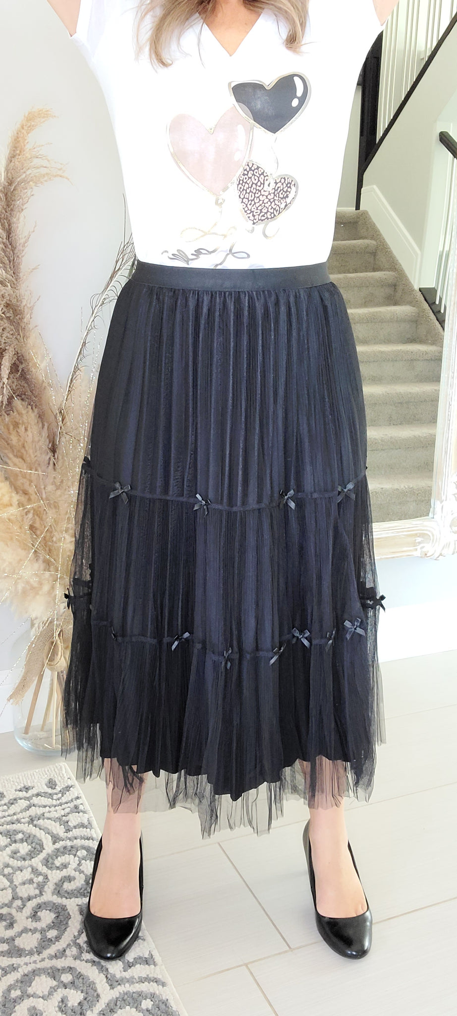 This playful tiered skirt gives you two fabulous looks in one! Wear the sleek black satin-look side for a chic, pleated style, or flip it to the fun tulle side adorned with charming bows. Perfect for mixing and matching—pair it with a simple tee for everyday flair or dress it up with our Bows + Stripes Cardigan or Mesh Cardigan Set for extra personality.